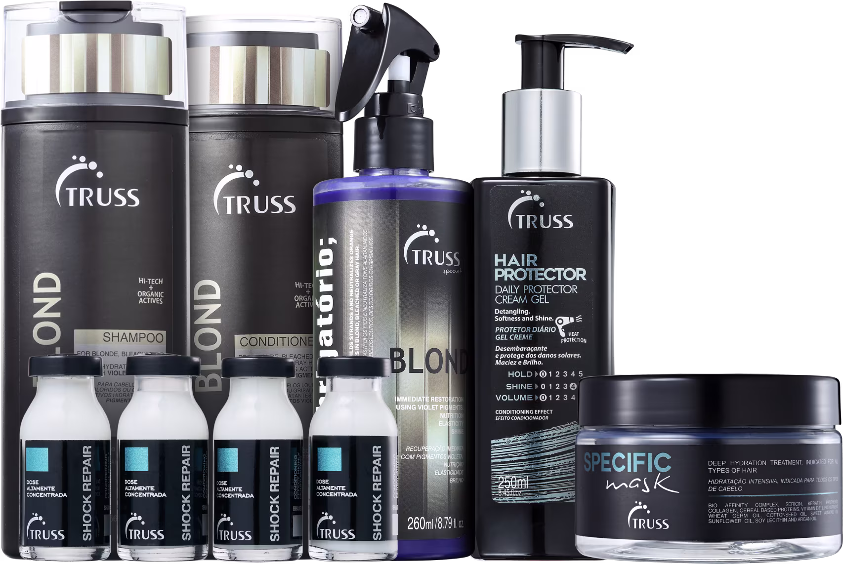 Eleve o nível dos serviços oferecidos no seu salão com o poderoso Kit TRUSS Repara e Desamarela o Loiro e entregue resultados incríveis aos seus clientes, tornando-os ainda mais satisfeitos e confiantes com seus cabelos!