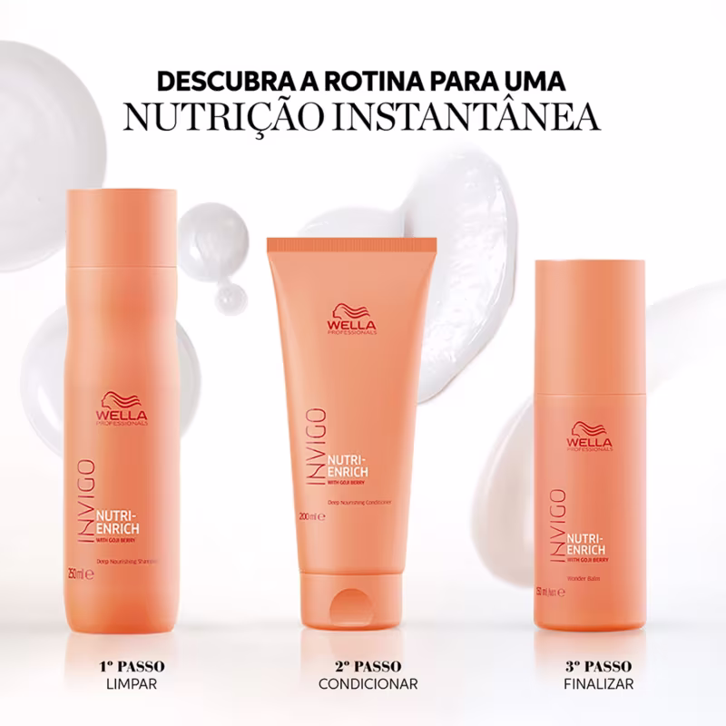 O Kit de tratamento para todos os tipos de cabelos Wella Professionals Invigo Nutri-Enrich Trio tem fórmula rica em ingredientes como Vitamina E e Pantenol que proporcionam nutrição e hidratação aos fios além de limpar e exalar um aroma frutal.