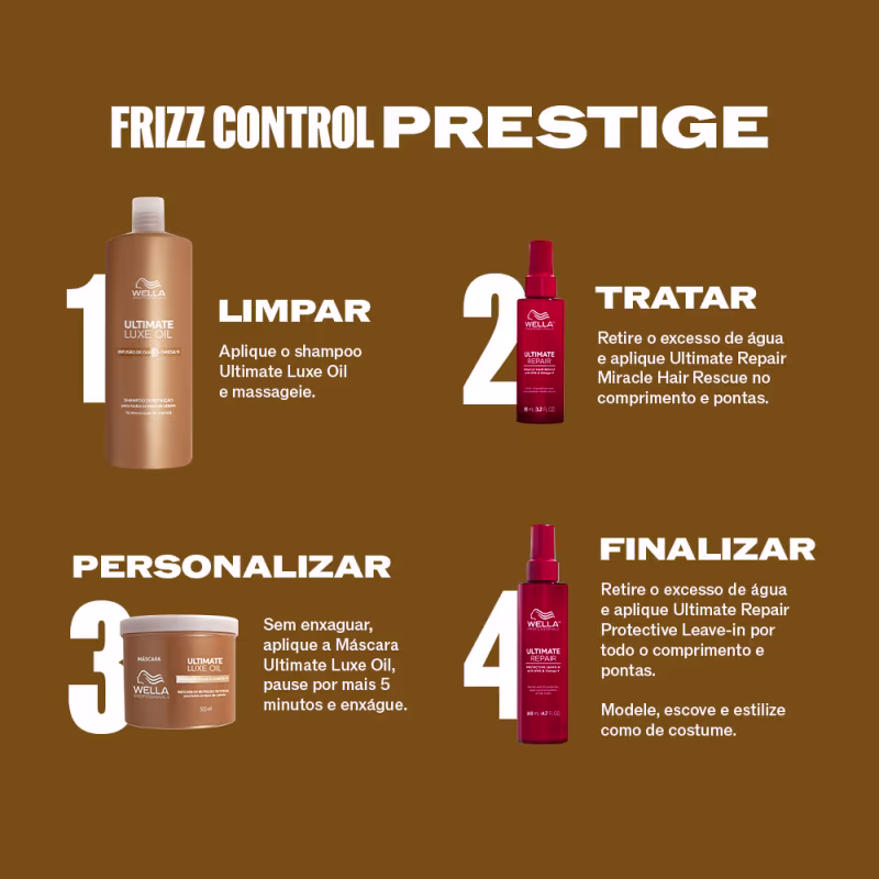 O Kit Wella Professionals Ultimate Frizz Control Prestige oferece um tratamento completo e luxuoso, combinando tecnologias avançadas das linhas Ultimate Luxe Oil e Ultimate Repair. Com fórmulas inovadoras, o kit proporciona reparação profunda, nutrição intensa e proteção capilar.