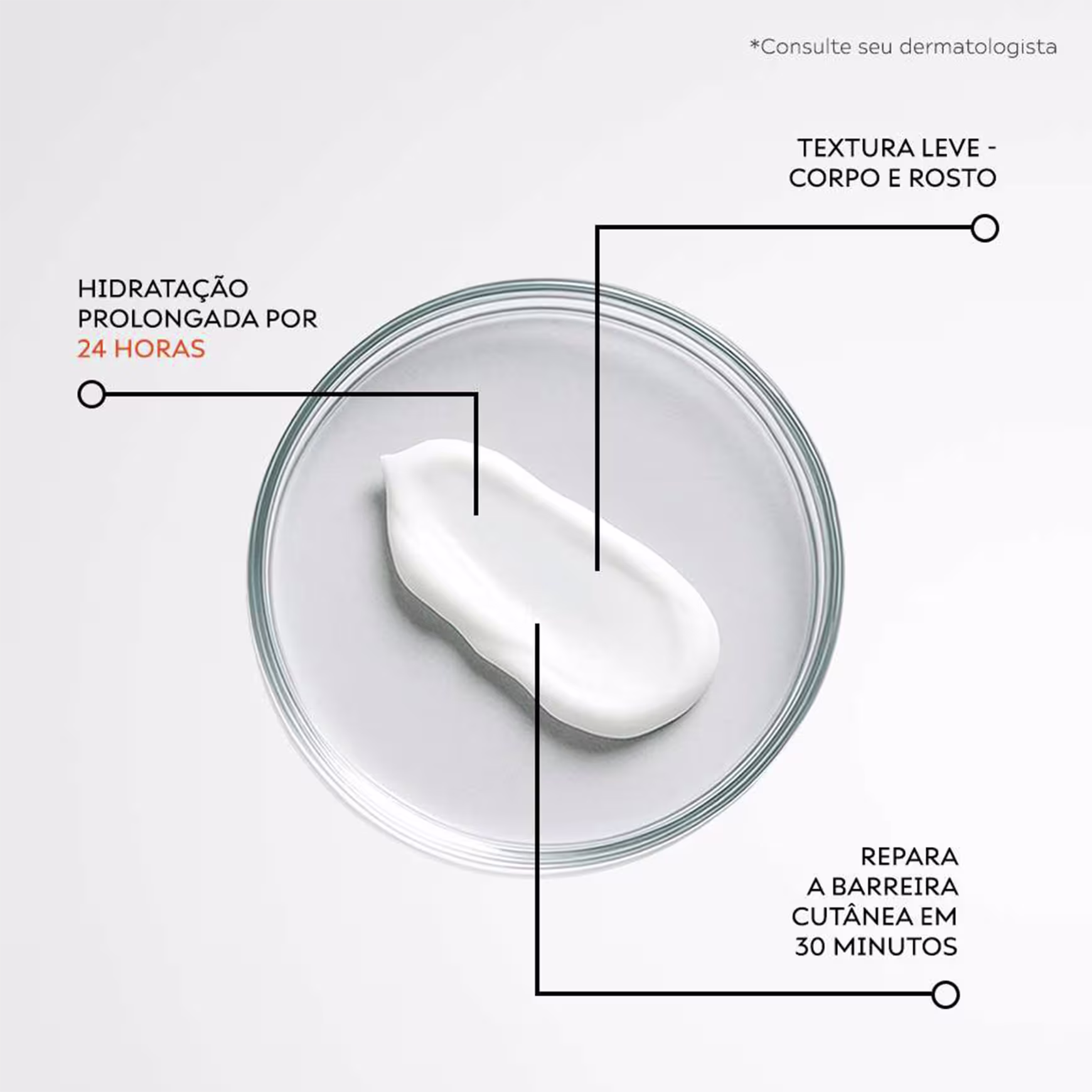 A composição livre de Fragrância, Parabenos, Sulfatos, Corantes Sintéticos, Silicone e Óleos Minerais garante um produto hipoalergênico e ideal para peles sensíveis, contribuindo para um cuidado dermocosmetico delicado e eficiente.
