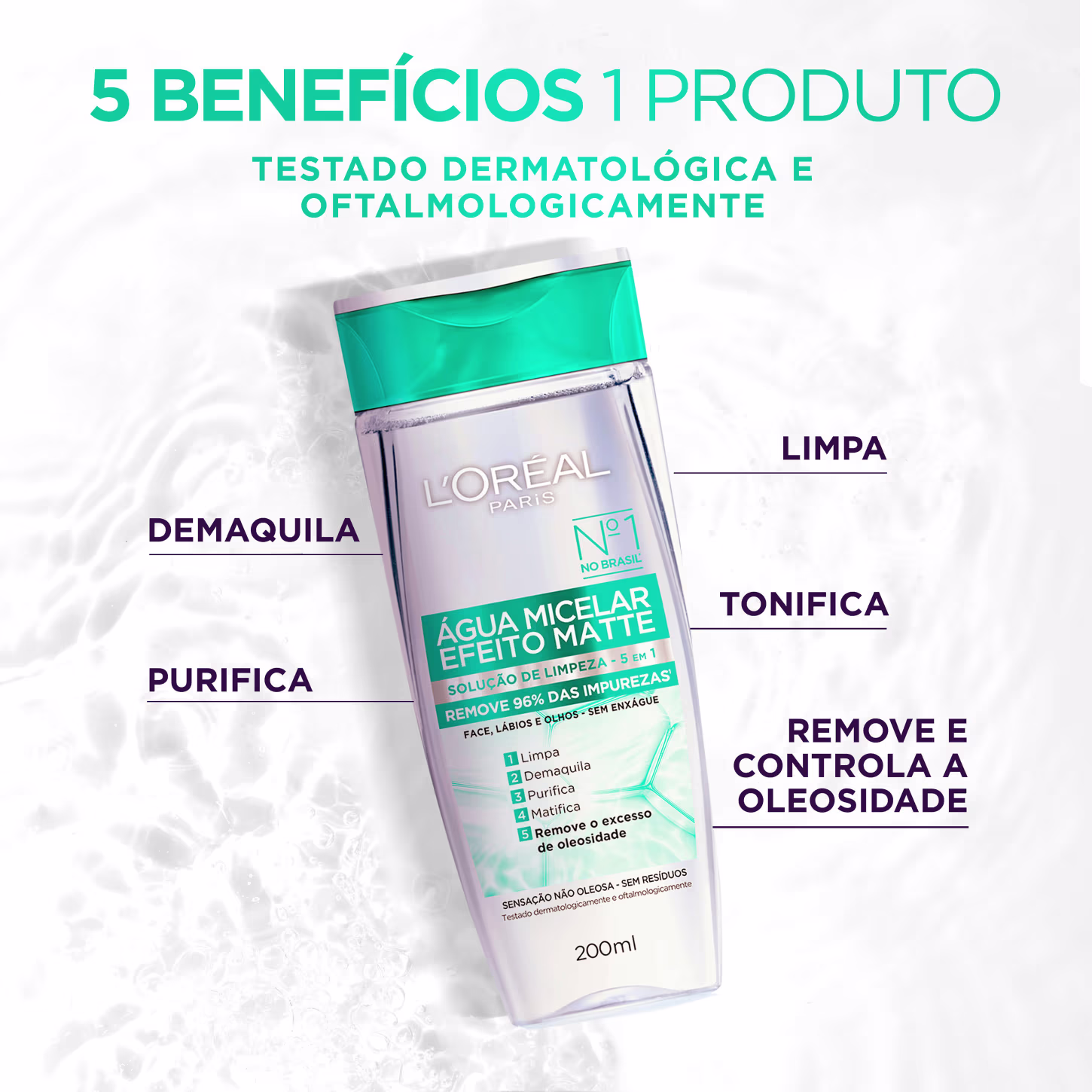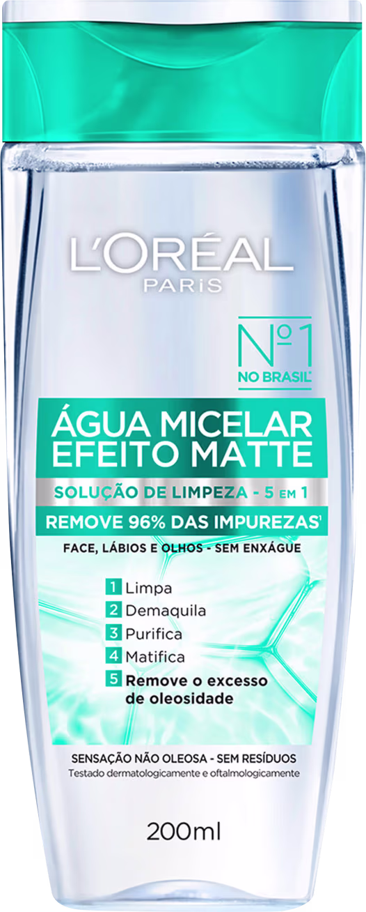 A Água Micelar L'Oréal Paris Efeito Matte é a solução perfeita para manter a pele livre de impurezas e suavizada, no seu momento de cuidado diário. Possui fórmula poderosa, não oleosa, composta por micelas, que deixam o rosto completamente limpo, com a hidratação em dia e aspecto sequinho, pelo efeito matte. A Água Micelar L'oreal conta com 5 benefícios em um só produto: limpa, demaquila, purifica, remove o excesso de oleosidade e reequilibra o rosto, de todo o rosto, olhos e boca.