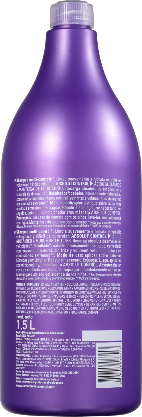Shampoo para cabelos volumosos e indisciplinados, sejam eles lisos, crespos ou cacheados. Promove uma limpeza eficaz do couro cabeludo e dos fios, sem ressecar. Aumenta a emoliência, a hidratação e promove a saúde capilar, ajudando a combater o volume excessivo e o frizz, sem pesar. Com uma fórmula de performance avançada, L'Oréal Professionnel Absolut Control Shampoo Multi-Controle - Shampoo 1500ml promove 30% mais hidratação, 65% de redução de volume e 80% de redução de frizz, proporcionando o controle absoluto do seu cabelo.