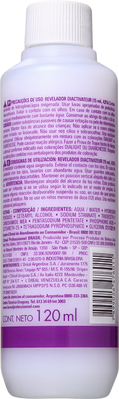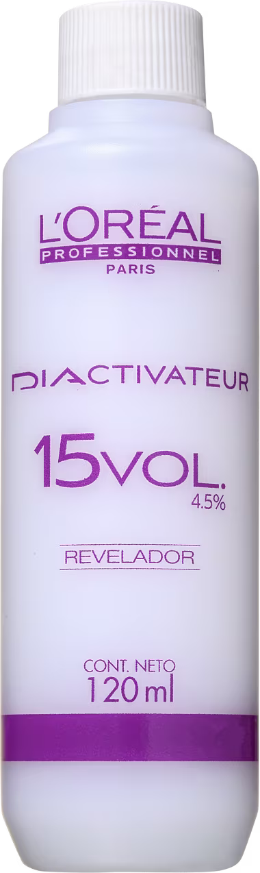 Emulsão reveladora oxidante 15 volumes. L’Oréal Professionnel Diactivateur apresenta cor de forma gradual, extremamente uniforme e sem danificar profundamente a fibra capilar.