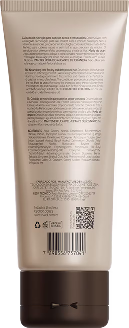 Condicionador para cabelos secos e opacos. Lowell Protect Care recupera vitalidade, controla frizz e proporciona brilho intenso.