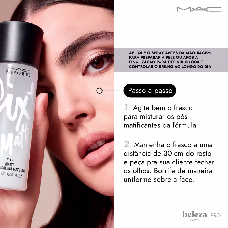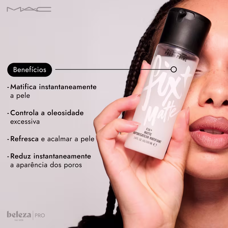 Primer e finalizador de maquiagem. M·A·C Prep + Prime Fix+ Matte Mist remove o brilho da oleosidade ao mesmo tempo em que refresca e aumenta a durabilidade da maquiagem. Ele é uma bruma de água leve que pode ser usada tanto antes de começar o visual quanto depois de pronto.