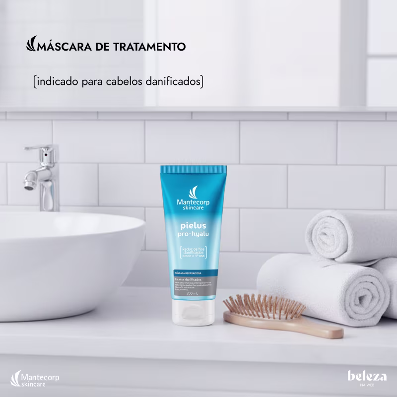 Máscara para cabelos danificados, quimicamente tratados ou expostos a agressões externas. Mantecorp Pielus Pro-Hyalu é hidratante com ácido hialurônico que nutre, recupera e protege os fios contra danos externos