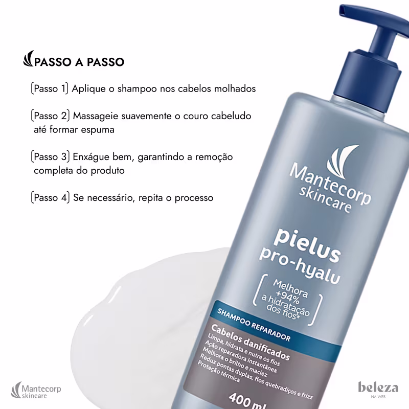 O Shampoo Reparador Pielus Pro-Hyalu, da Mantecorp, traz fórmula exclusiva combina Ácido Hialurônico, Queratina, Peptídeos e Aminoácidos, proporcionando hidratação profunda e nutrição excepcional para os fios. Ideal para cabelos ressecados, com pontas duplas e frizz, atua na reestruturação das propriedades naturais dos cabelos. Os ativos principais trabalham de forma sinérgica: o Ácido Hialurônico promove intensa hidratação, a Queratina fortalece a estrutura capilar, os Peptídeos auxiliam na recuperação e os Aminoácidos garantem nutrição profunda. O produto é especialmente indicado para pessoas com couro cabeludo sensível, eliminando acúmulo de resíduos e reduzindo irritações. Sua textura leve permite penetração profunda sem agredir ou pesar nos fios, garantindo maciez, brilho e movimento.