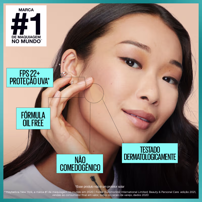 A Base Líquida Maybelline Fit Me FPS 22 uniformiza o tom do rosto com uma fórmula especial compatível com a pele das brasileiras. Controla a oleosidade por até 16 horas com sua argila matificante, além de proporcionar um efeito natural, se adaptando a pele, e com sensação confortável. Além disso, conta com com FPS 22 + proteção UVA. Ideal para todos os tipos de pele, principalmente para peles oleosas.