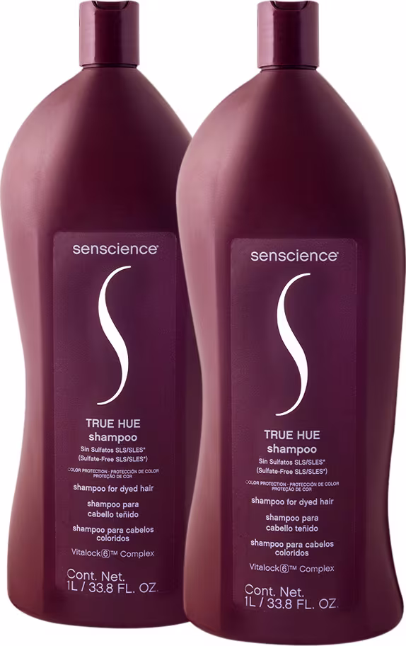 Senscience True Hue - Shampoo 1L (2 unidades): shampoo sem sulfato para cabelos naturais ou coloridos. Limpa o cabelo com sua fórmula suave, mas extremamente eficaz, sem agredir. Seu uso contínuo preserva até 98% da coloração. Também ajuda a condicionar os fios e protege dos raios solares, um dos principais causadores da oxidação e do desbotamento.