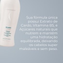 Máscara: no cabelo limpo e úmido, aplique a máscara e deixe agir por 5 minutos. Enxágue.