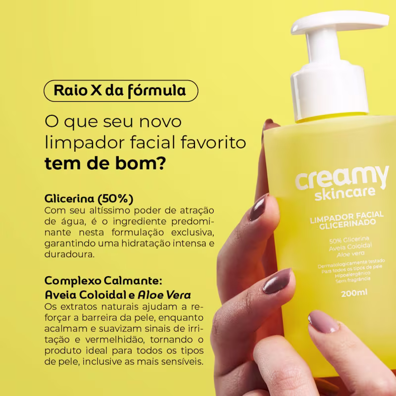 Creamy Skincare - Limpador Facial Glicerinado 200ml: para todos os tipos de pele, até as mais sensíveis. Promove limpeza eficaz e suave. Com 50% de glicerina, proporciona intensa hidratação e suavidade à pele, enquanto fortalece a barreira protetora contra agressões externas. Enriquecido com extratos de aloe vera e avena sativa, acalma e minimiza irritações. Pele limpa, hidratada e protegida.