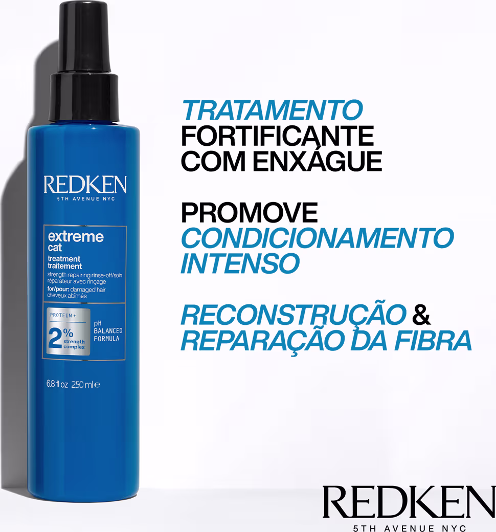 Redken Extreme Cat - Tratamento Reconstrutor 200ml: para cabelos danificados. Tratamento com proteína líquida que age como reconstrutor, fortalecendo e recuperando os danos na fibra. Com fórmula potente e que não pesa nos fios.