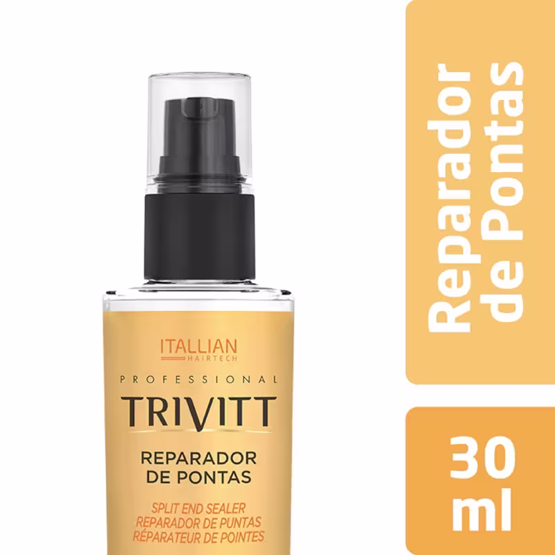 Reparador de Pontas c/ Filtro Solar 30mlRecupera o brilho, repara pontas partidas formando um filme protetor nos fios. Itallian Trivitt Reparador de Pontas é um reparador de pontas para todos os tipos de cabelo. Recupera o brilho, repara as pontas duplas e condiciona os fios. A tecnologia com silicones de Itallian Trivitt Reparador de Pontas forma uma película que protege o cabelo e deixa os fios macios e com brilho luminoso sem que eles fiquem pesados ou oleosos.