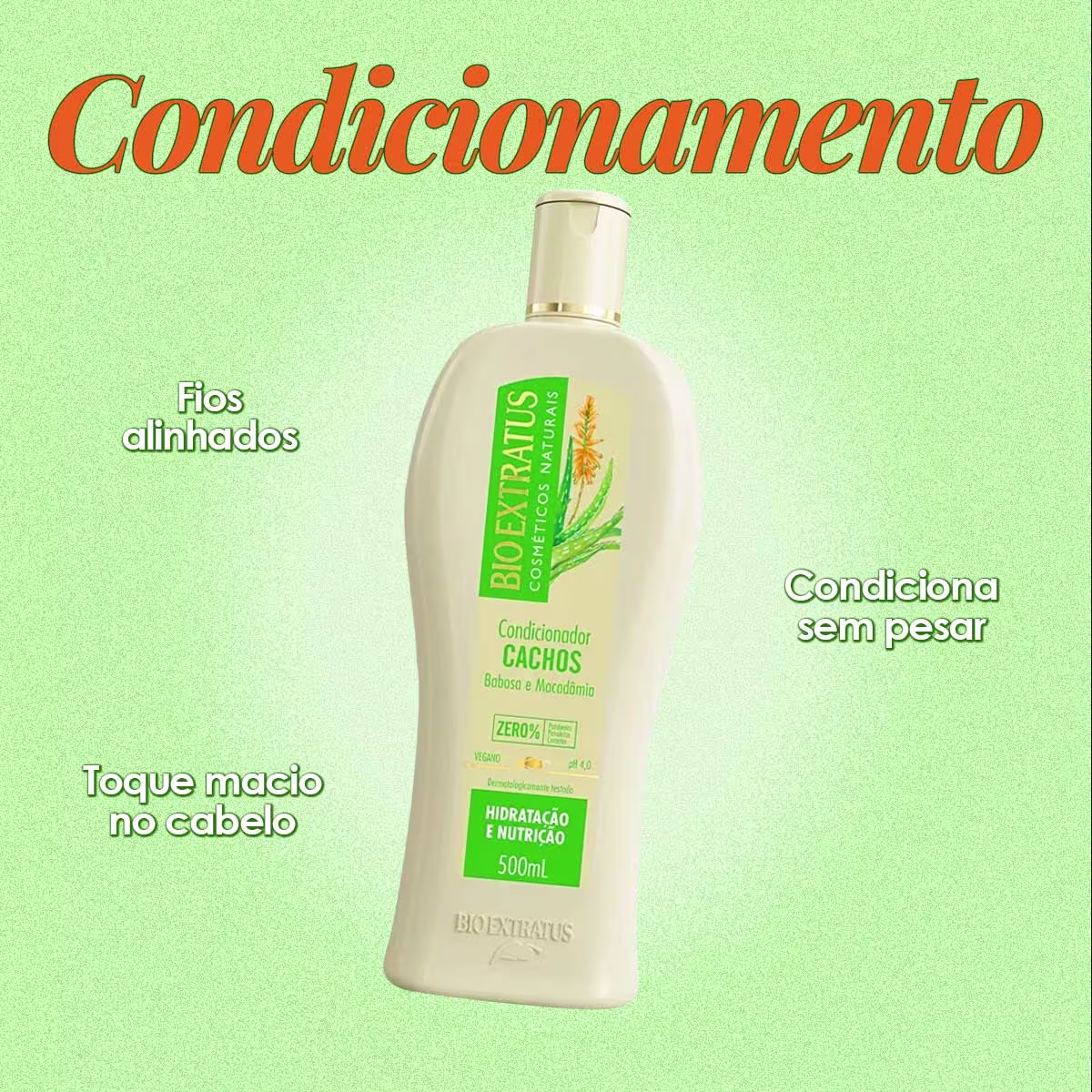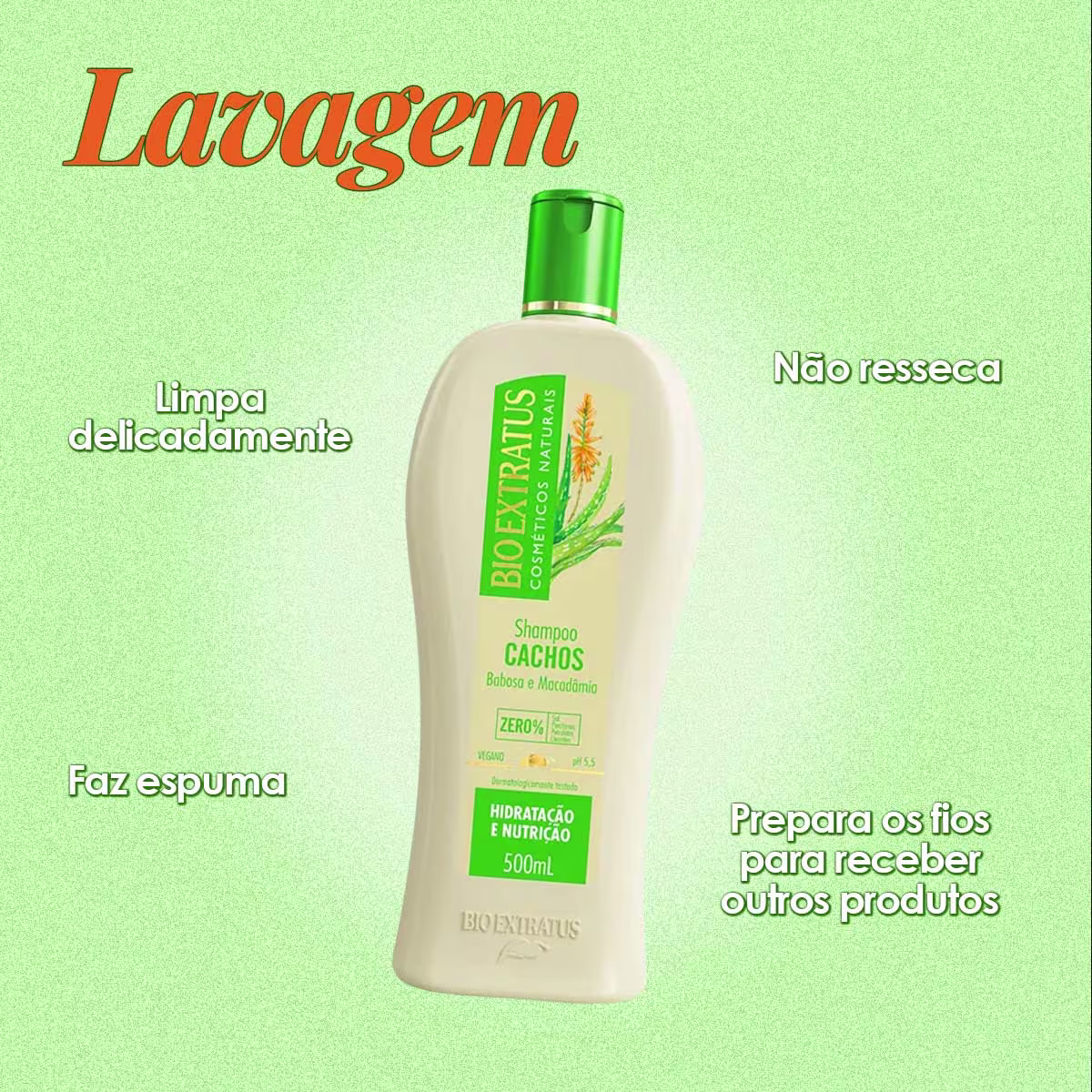 Bio Extratus Cachos Babosa - Hidratação e Nutrição com Babosa e Macadâmia Este Kit ContémBio Extratus Cachos Babosa - Shampoo 500ml: para cabelos cacheados. Promove limpeza suave, preparando os fios para receber tratamento sem ressecar. Formulado pH 5,5, babosa e macadâmia, garante hidratação e nutrição intensa, tratando profundamente os cachos.Bio Extratus Cachos Babosa - Condicionador 500ml: nutre, hidrata e condiciona imediatamente os fios, resultando em cabelos fortalecidos e mais bonitos. Formulado pH 4,0, babosa e macadâmia, garante hidratação e nutrição intensa, tratando profundamente os cachos. Bio Extratus Cachos Babosa - Máscara Banho de Creme 230g: tratamento intensivo, garante maciez, brilho e fios saudáveis. Enriquecido com babosa e óleo de macadâmia, nutre e hidrata profundamente, devolvendo vitalidade e definição aos cachos. Conselho de AplicaçãoShampoo: aplique nos cabelos molhados, massageando suavemente. Enxágue. Se necessário, repita a aplicação. Condicionador: após lavar os cabelos, aplique o condicionador, massageando suavemente. Para maior absorção dos ativos, deixe agir por alguns minutos. Enxágue. Máscara: aplique o creme, massageando da raiz até as pontas. Deixe agir de 3 a 5 minutos. Enxágue.