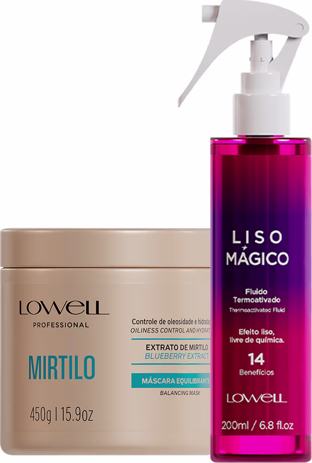 Kit Lowell Extrato de Mirtilo Tratamento Termoativado (2 Produtos) Lowell Extrato de Mirtilo Alto Impacto Capilar promove um tratamento que resgata a aparência saudável do fio e garante brilho intenso. Lowell Liso Magico Fluido Termoativado proporciona diversos benefícios aos fios durante o uso do secador e da chapinha para um cabelo perfeito sem o uso de químicas! Contém: Lowell Extrato de Mirtilo Alto Impacto - Máscara Capilar 450g: trata e resgata a aparência saudável do cabelo. Lowell Liso Magico - Fluido Termoativado 200ml: Fluído termoativado para todos os tipos de cabelo. Liso Mágico Lowell promove efeito liso sem frizz com maciez e brilho intensos. Modo de uso Conselho de Aplicação Mascara MIRTILO: Com o cabelo limpo e úmido, aplique a máscara do comprimento às pontas. Deixe agir por 3 minutos e enxágue bem. Fluido Termoativado: Borrife o fluído termoativado Lowell Liso Mágico no cabelo limpo e úmido da raiz às pontas e siga com a escovação dos fios. Se desejar, complete com a chapinha.