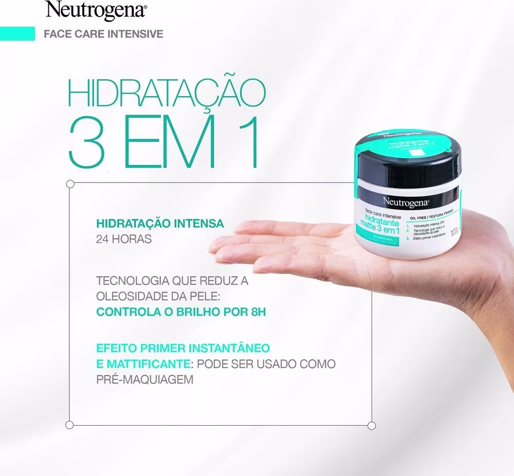 Hidratante facial mattificante. Neutrogena Face Care Intensive Matte 3 em 1 oferece hidratação prolongada por 24h e efeito primer instantâneo.