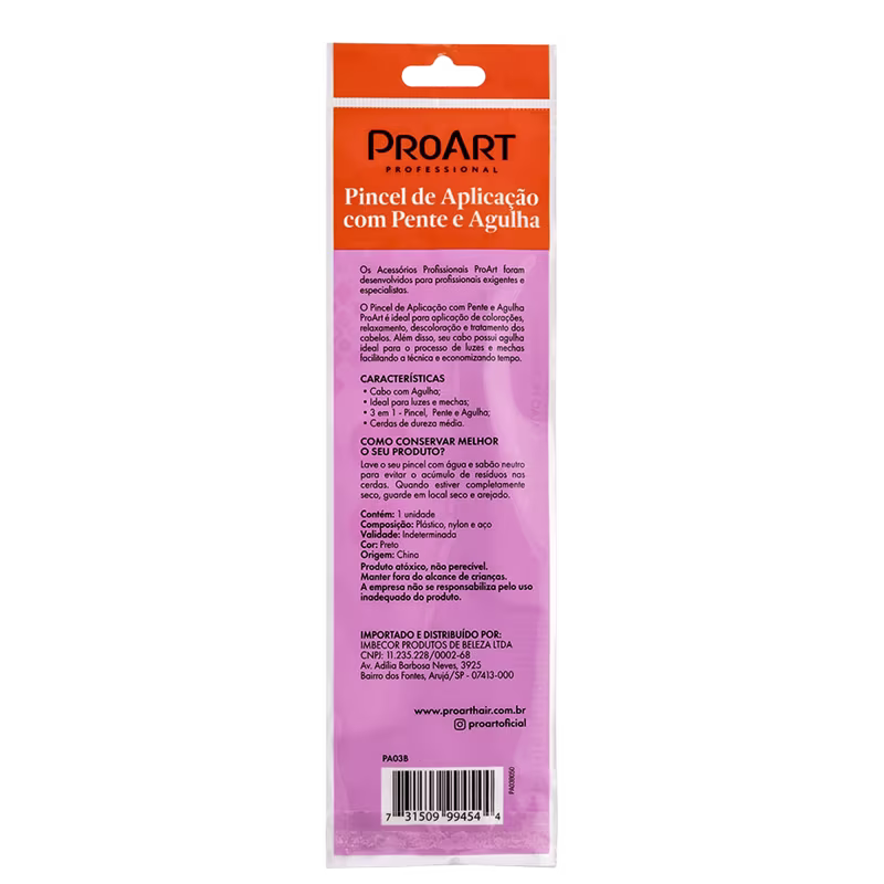 Pincel de aplicação com pente e agulha. ProArt 3 em 1 facilita a aplicação de colorações, relaxamento, descoloração e tratamento dos cabelos.