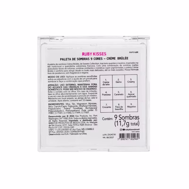 A Paleta de Sombras Ruby Kisses Sweets Collection oferece uma curadoria de tons versáteis, combinando acabamentos mattes ultrafinos com sombras cintilantes e metálicas de alta pigmentação. Sua textura macia e fácil de esfumar garante transições suaves, permitindo desde looks naturais até composições intensas e elaboradas.