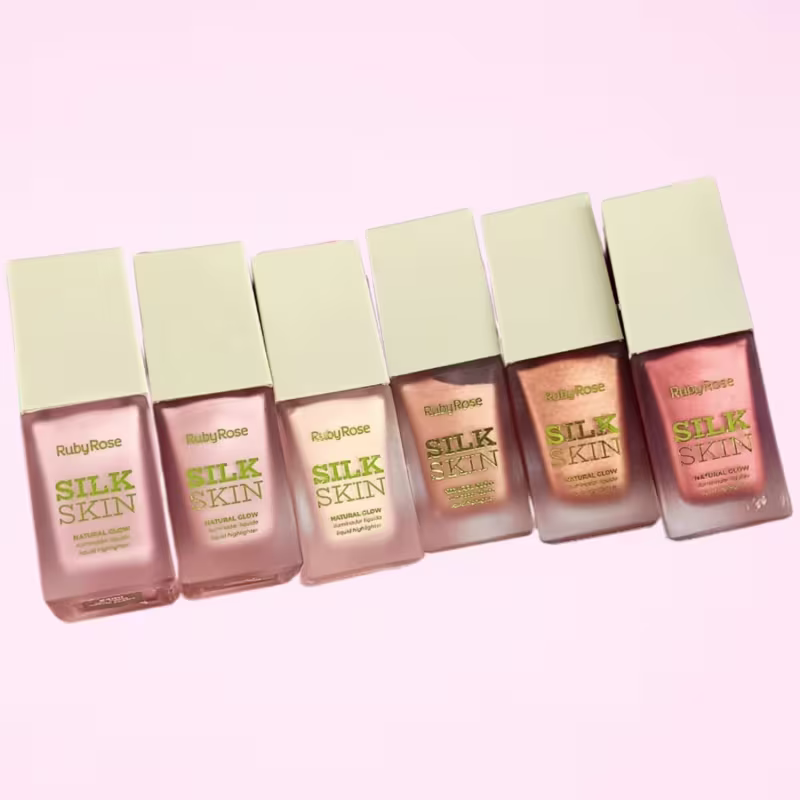 Iluminador líquido com partículas ultrafinas. Ruby Rose Silk Skin Natural Glow proporciona um maravilhoso efeito glow, com acabamento natural.