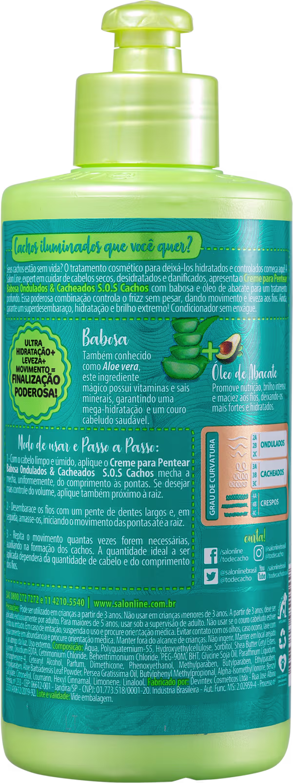 O Creme de Pentear S.O.S Cachos Babosa Ondulados & Cacheados Salon Line faz uma hidratação enquanto finaliza o visual. Possui uma ação anti-frizz, definição impecável e um brilho impecável.
