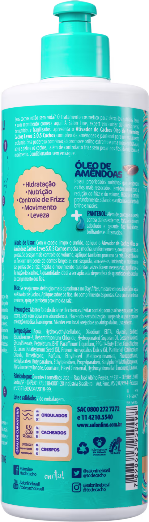 O Ativador de Cachos S.O.S Cachos Leves Salon Line une finalização com tratamento. Assim, faz uma hidratação poderosa, ativa e define os cachos, controla o frizz e confere brilho extremo. Tudo isso sem pesar nos fios.
