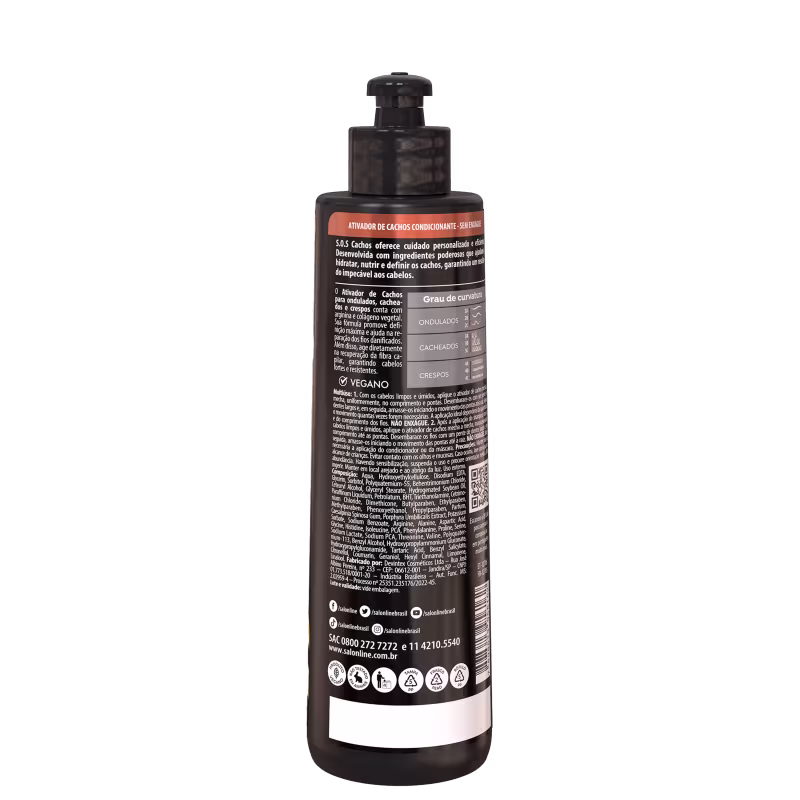 Ativador de cachos para cabelos ondulados, cacheados, crespos e em transição. Salon Line S.O.S Cachos Reconstrução Arginina Ativador de Cachos recupera os fios danificados enquanto define os cachos e reduz o frizz. Possui ação umidificadora.