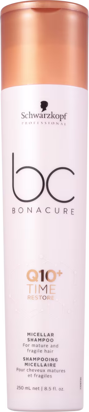 Shampoo para cabelos maduros, desgastados, secos e sem vida. BC Q10+ Time Restore Micellar limpa delicadamente e controla fios rebeldes. Proporciona fios mais maleáveis e elásticos, cheios de vida.
