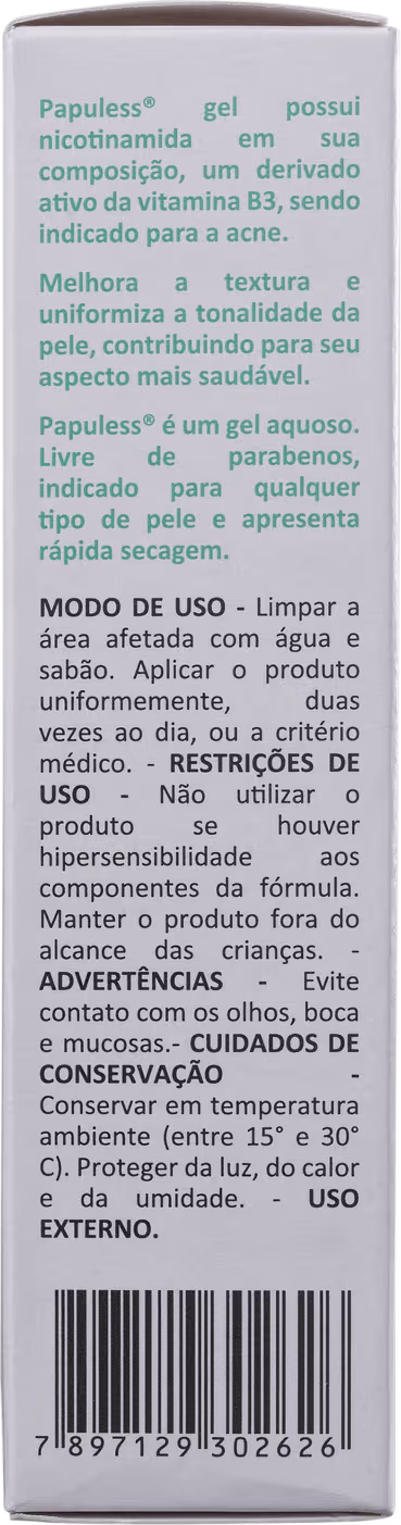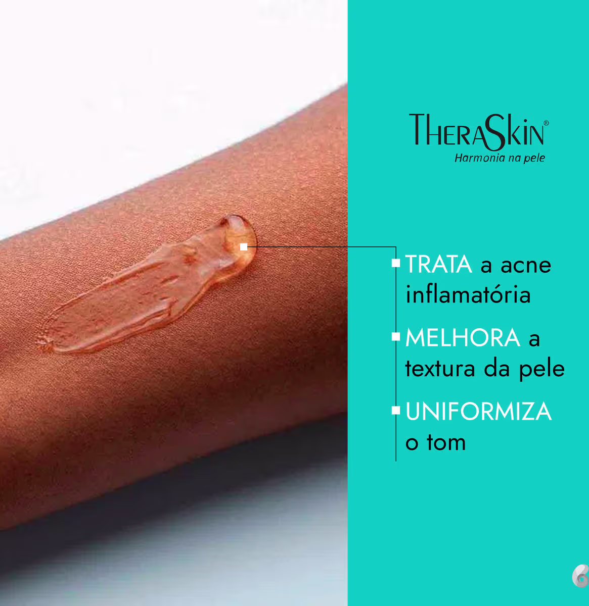 TheraSkin Papuless Gel Antiacne possui nicotinamida, derivado ativo da vitamina B3, com ação anti-inflamatória e clareadora. Seu uso diário deixa a pele livre de acne, com aspecto mais uniforme e sem sinais inflamatórios.