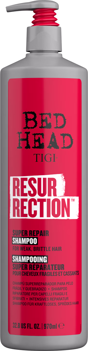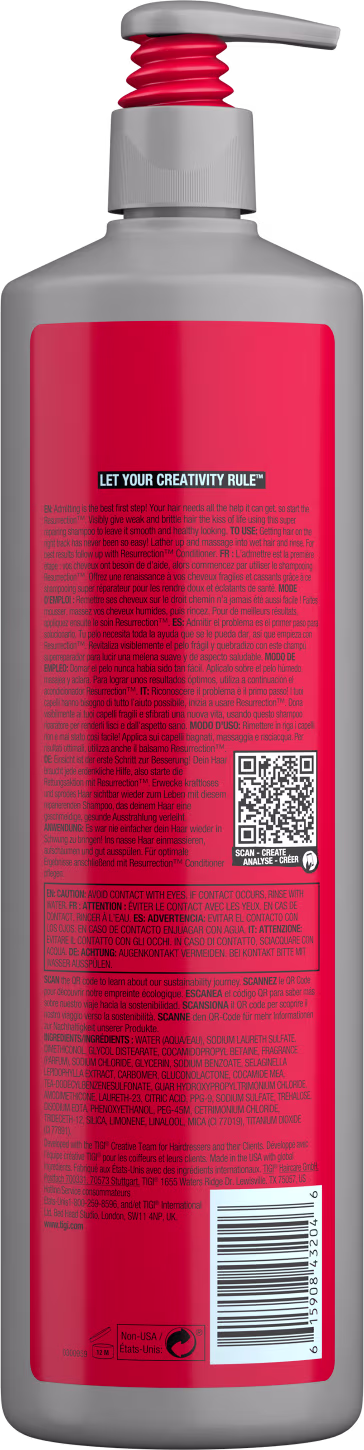 O Shampoo TIGI Bed Head Resurrection possui uma fórmula de reparação avançada, enriquecida com ativos que revitalizam e fortalecem os cabelos danificados, proporcionando maior elasticidade, suavidade e um aspecto mais saudável.