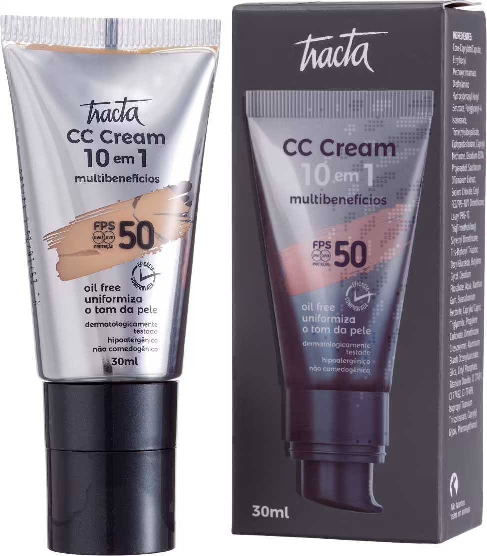 O CC Cream Tracta 10 em 1 Multibenefícios FPS50 contém poderosos ativos em sua fórmula que proporcionam: proteção dos nocivos raios UVA e UVB, controle a oleosidade, hidratação, uniformização do tom, redução de sinais de envelhecimento, efeito matte, disfarce de poros e imperfeições e muito mais. Sua textura leve e confortável, oil free, não comedogênica e garante efeito anti-acne, que melhora o aspecto de espinhas e cravos. Não contém álcool e parabenos.