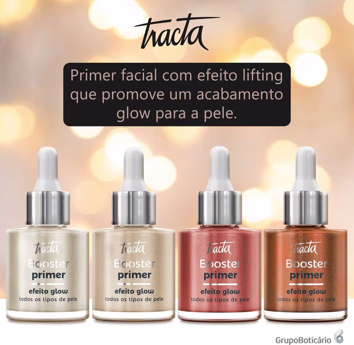 Primer Tracta Booster Glow contém micropartículas de pérolas que proporcionam nuances de um efeito glow, dando um toque especial para a maquiagem. Ele tem textura leve sérum, com rápida absorção. A fórmula rica em Extrato da Semente de Lentilha, Ácido Hialurônico, Tripeptídeo e promove a preparação para a aplicação da maquiagem contribuindo para uma longa duração e fixação.