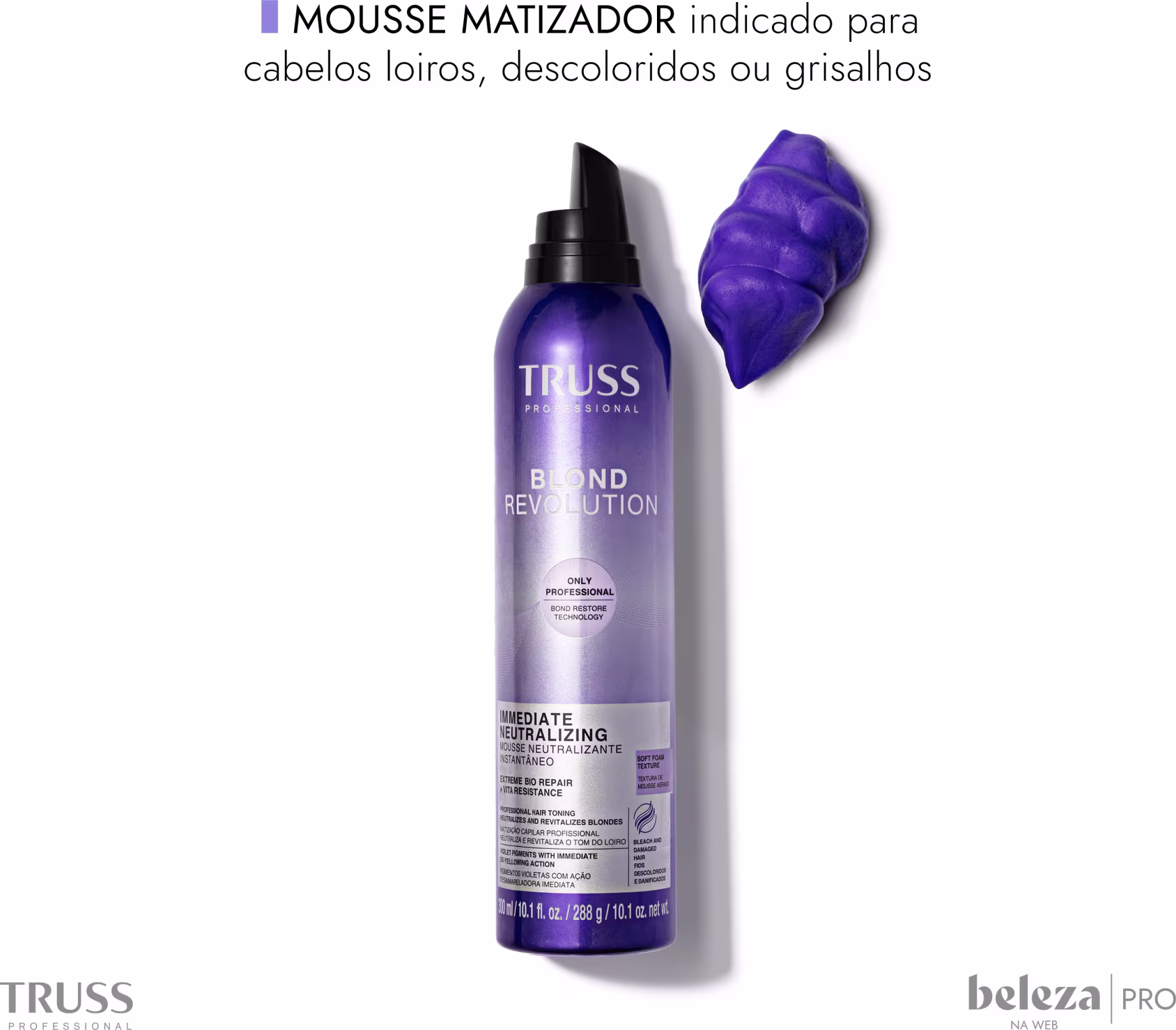 Mousse Neutralizante TRUSS Blond Revolution Pro Instant Neo: matização capilar profissional que neutraliza e revitaliza o tom do loiro. Garanta as melhores ofertas e produtos TRUSS na BLZ PRO Ver mais ❯