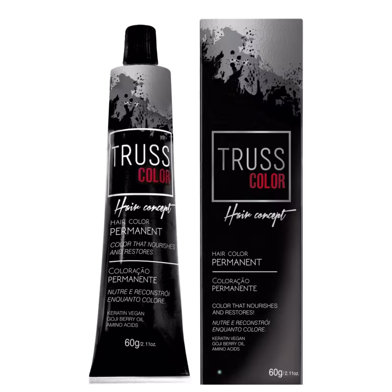 Coloração permanente com queratina vegana, nutre e reconstrói os fios, cobrindo brancos e proporcionando tons vibrantes com óleo de Goji Berry. Truss Color Hair Concept é uma solução profissional desenvolvida para coloração capilar com tecnologia avançada.