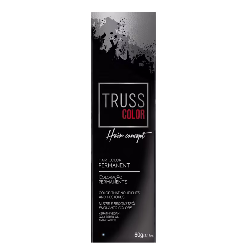Coloração permanente com queratina vegana, nutre e reconstrói os fios, cobrindo brancos e proporcionando tons vibrantes com óleo de Goji Berry. Truss Color Hair Concept é uma solução profissional desenvolvida para coloração capilar com tecnologia avançada.