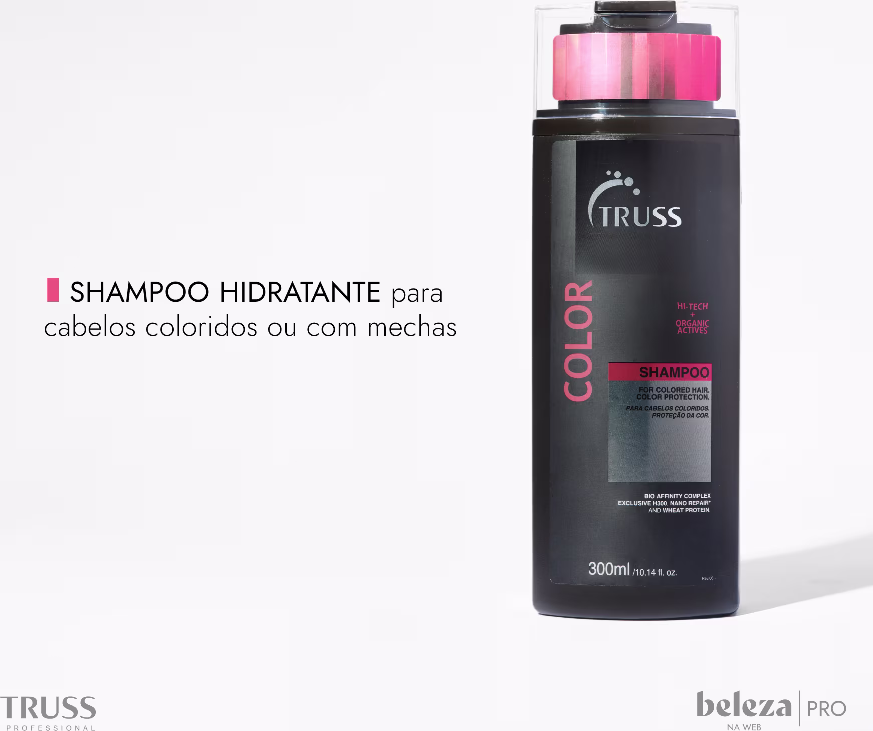 Shampoo para cabelos coloridos ou com mechas. Truss Color limpa suavemente enquanto previne o desbotamento e alteração da cor.