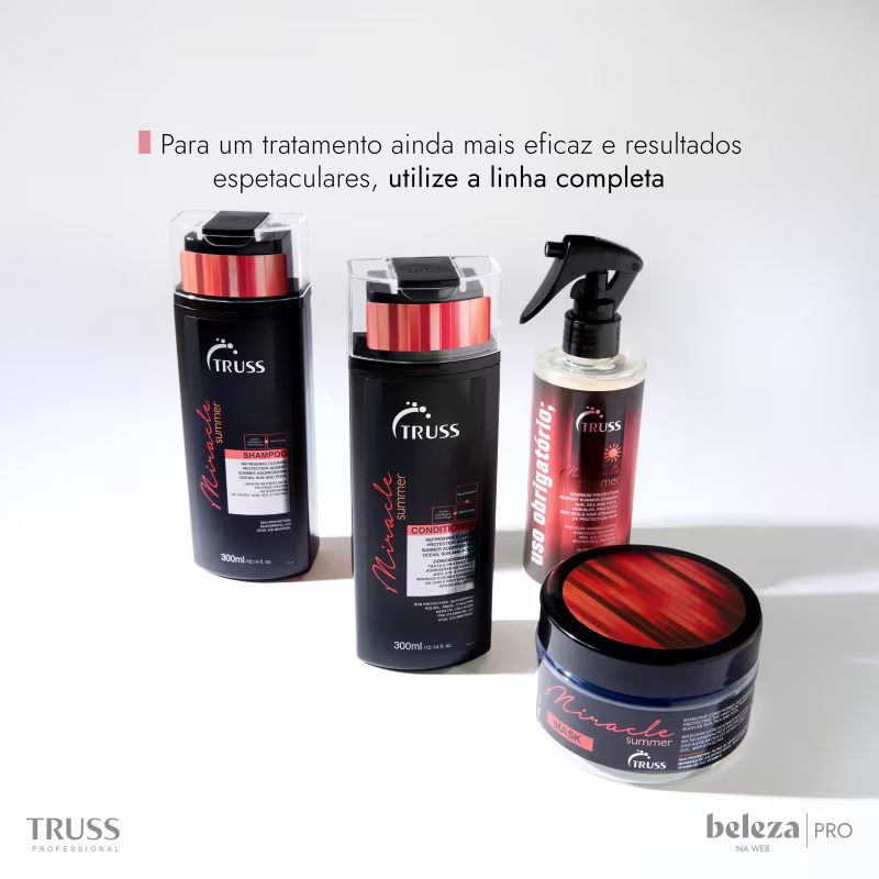 Miracle Summer, de Truss, é a linha dedica a remoção de resíduos e sujeiras de piscina, mar, etc, com proteção dos fios durante a exposição. O sensorial durante o uso promove frescor e profissional pode usar tanto como tratamento, para clientes que voltaram de viagem ou férias, quanto em cabelos com raiz oleosa e pontas secas. Já o item Uso Obrigatório Summer inibe o tom esverdeado.