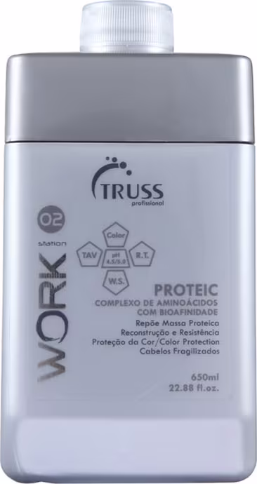 Tratamento reconstrutor para cabelos quebradiços e fragilizados. Truss Work Station Proteic aumenta a resistência e auxilia no crescimento.