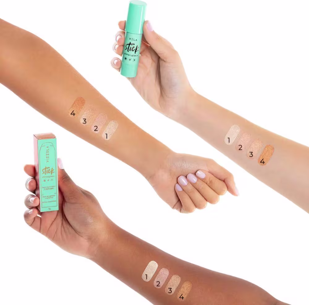 Iluminador em stick. Vizzela Cosméticos Shine & Glow tem textura cremosa, efeito espelhado e acabamento natural para pele radiante em 4 tons.